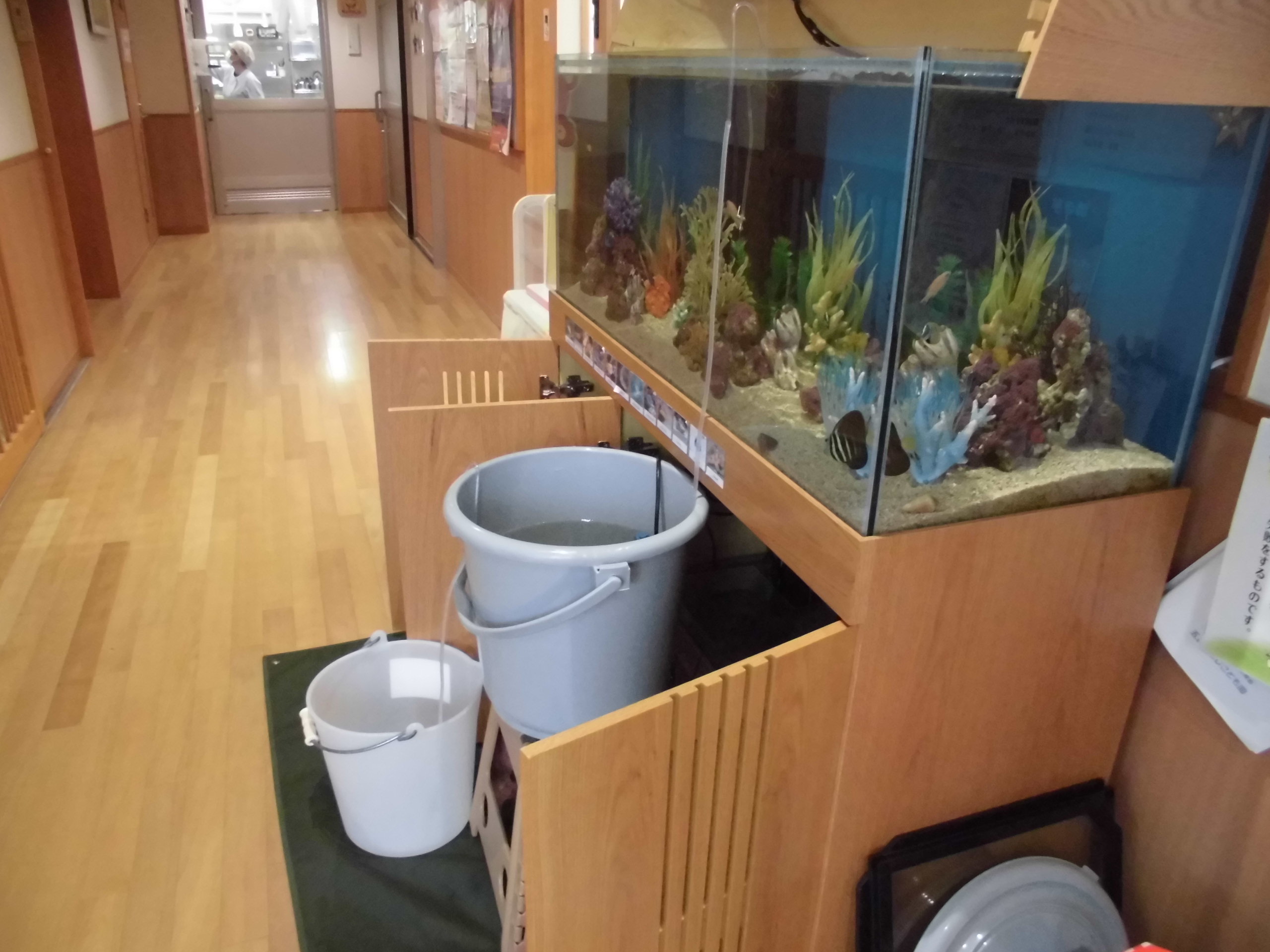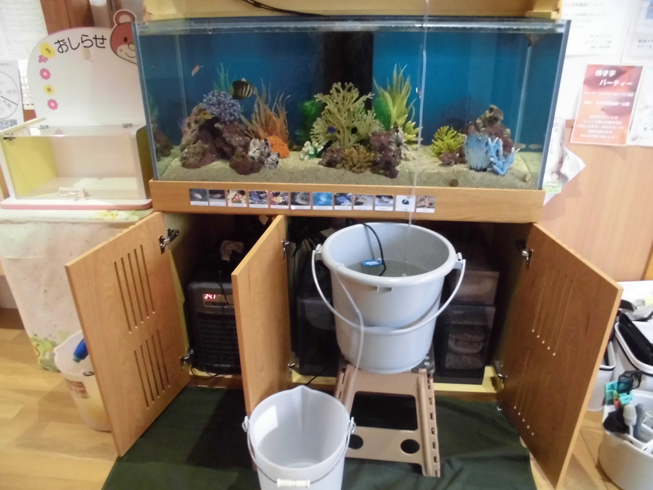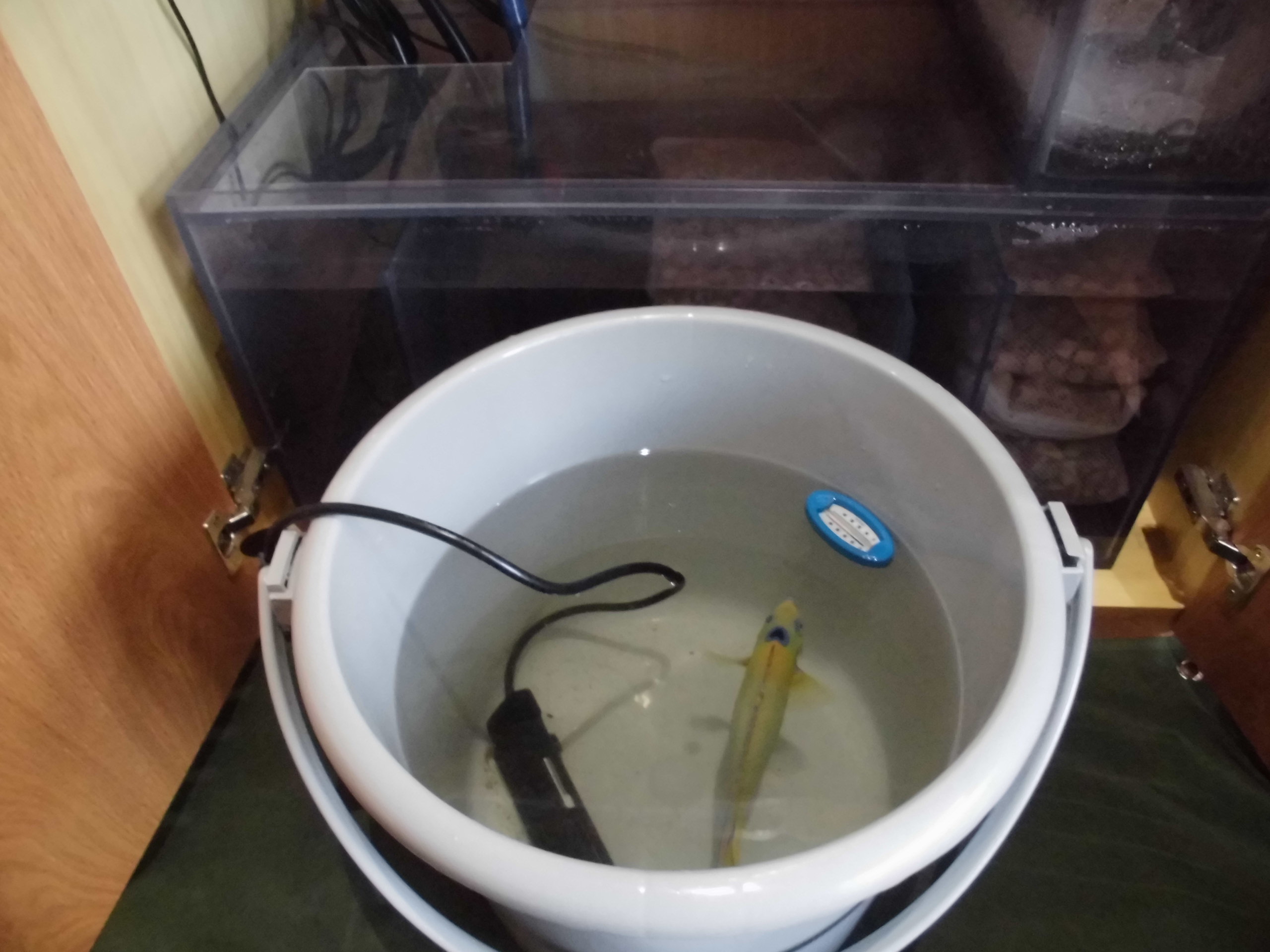 現地において、バケツ内の水温をヒーターにより水槽と同じ水温に合わせ、点滴法で水合わせをしました。