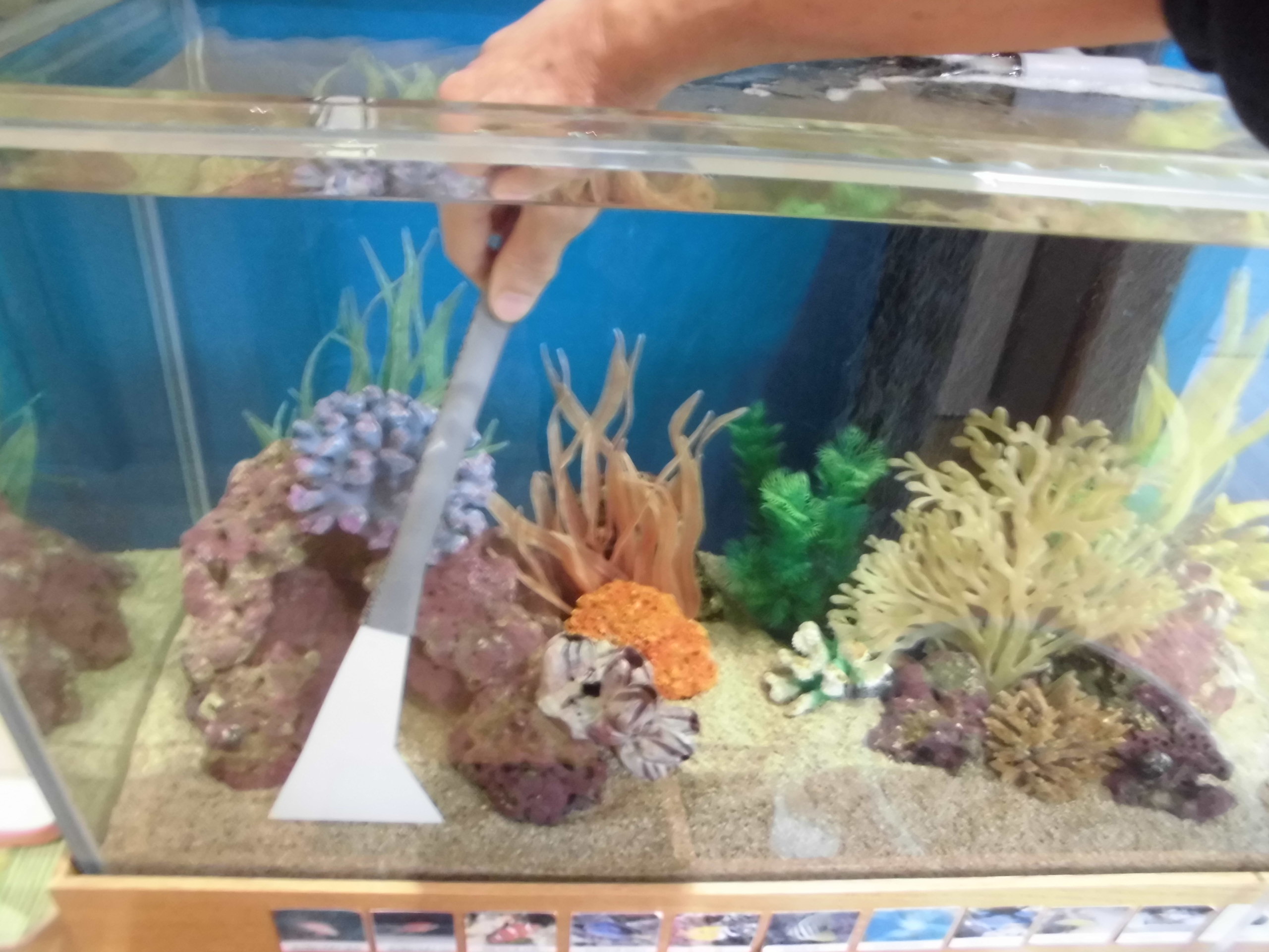 水槽のコケ取りなどメンテナンス作業をしながら、水合わせを1時間半程度行い、クイーンエンゼルをバケツから水槽に投入しました。